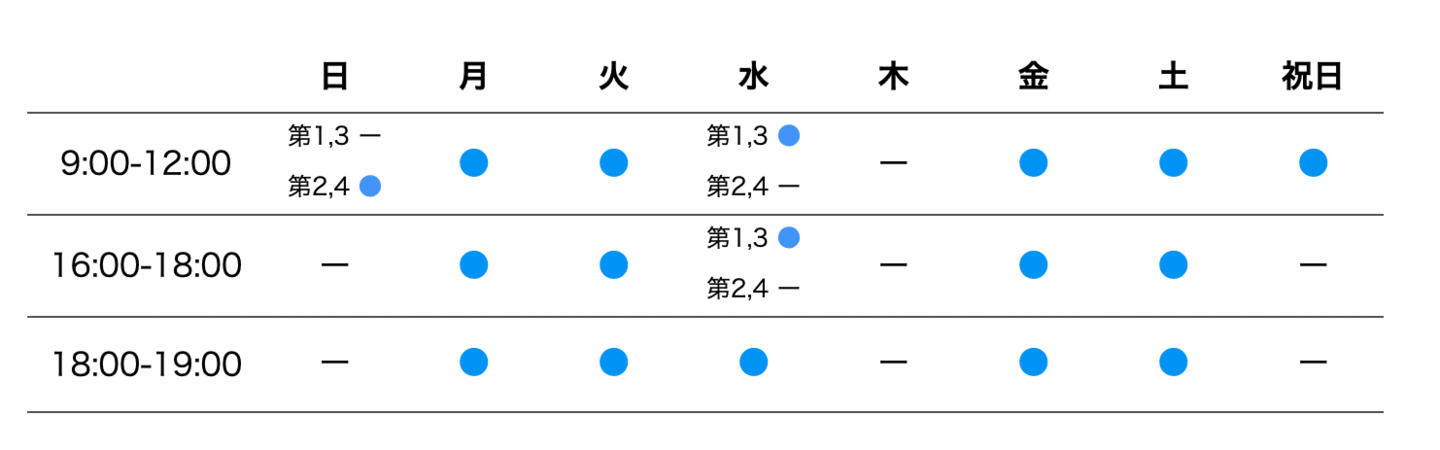 夜間診療(18:00〜・電話は18:30まで)は、別途料金が発生します。